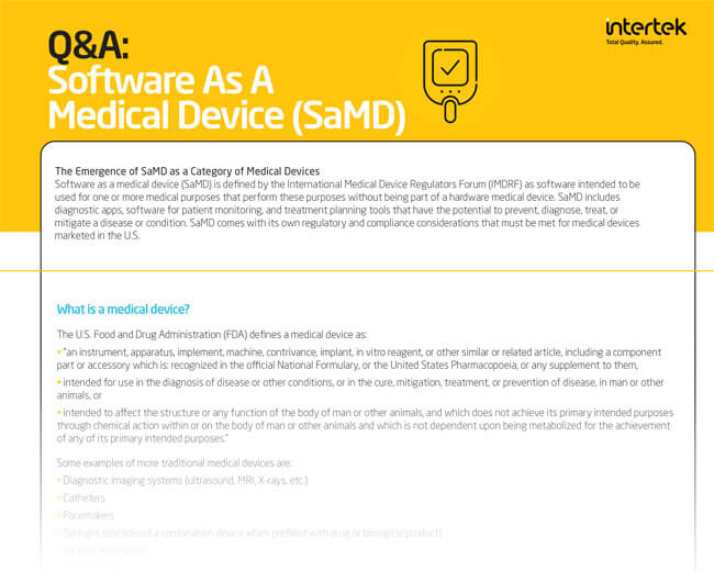 The International Medical Device Regulators Forum (IMDRF) defines Software as a Medical Device (SaMD) as follows: “software intended to be used for one or more medical purposes that perform these purposes without being part of a hardware medical device." It has emerged as a category of medical devices unto itself and has its own regulatory and compliance considerations that must be met.