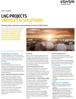 Our LNG clients need their projects to deliver long-term, sustainable success in a fast ever-changing world. We work closely with owners and operators, partnering with them to maximize the value of complex projects while minimizing risks that impact quality, safety and efficiency. We do this by delivering trusted total quality assurance solutions that our clients have come to rely on during the full lifecycle of their upstream, midstream and downstream projects.