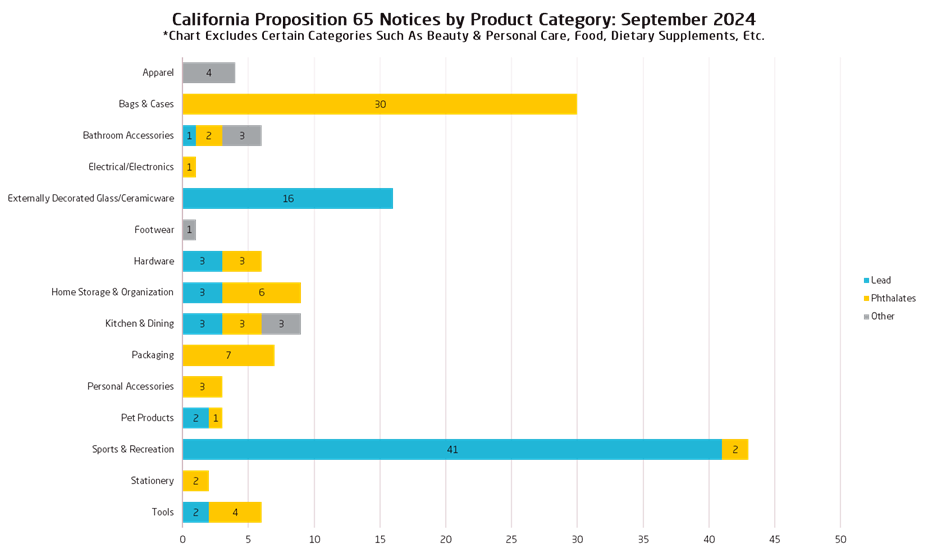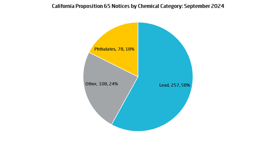 In September 2024, there were 447 60-day notices for violation of Prop 65, of which 58% of the notices served were for the category of Lead, 18% of notices were served for the presence of Phthalates, 24% of the notices were for the presence of Other chemicals.